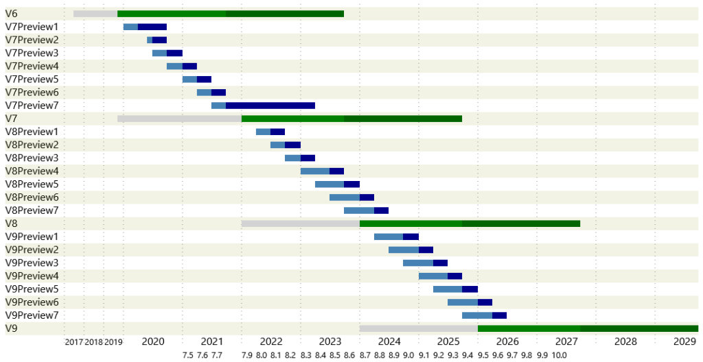 Одночасно підтримуються дві останні LTS-версії та до двох Preview-версій.