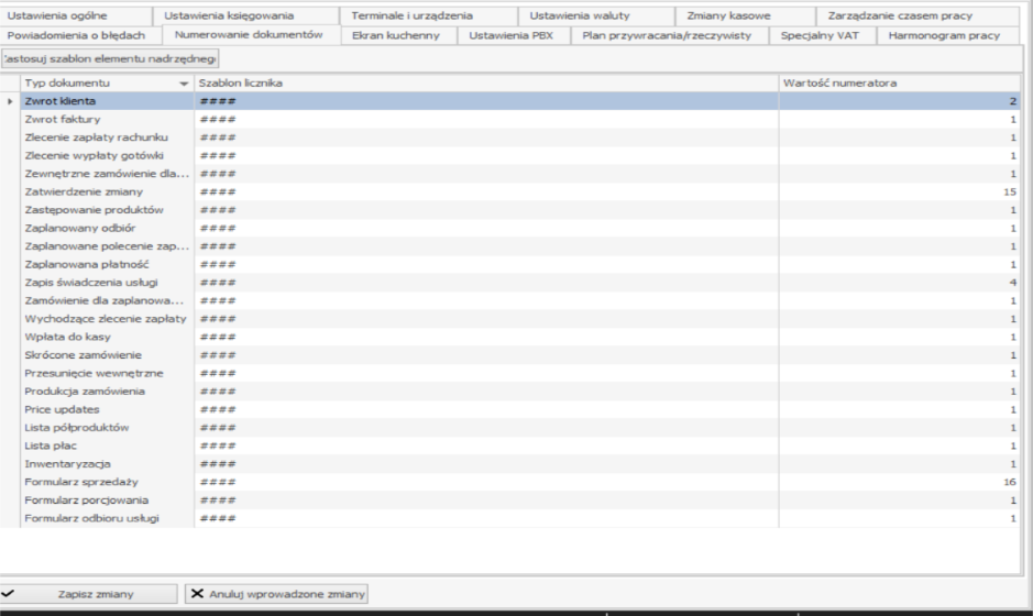 1. Otwórz zakładkę Numeracja dokumentów w ustawieniach przedsiębiorstwa handlowego. Zawiera ona listę wszystkich dokumentów, dla których można określić szablon, szablony można przypisać oraz aktualną wartość automatycznego licznika. Można zmienić wartość licznika, która zostanie uwzględniona w numerze następnego nowego dokumentu. Aby nadpisać wzorzec numeracji, należy kliknąć w wiersz z nazwą typu dokumentu. Numer może składać się z następujących elementów: