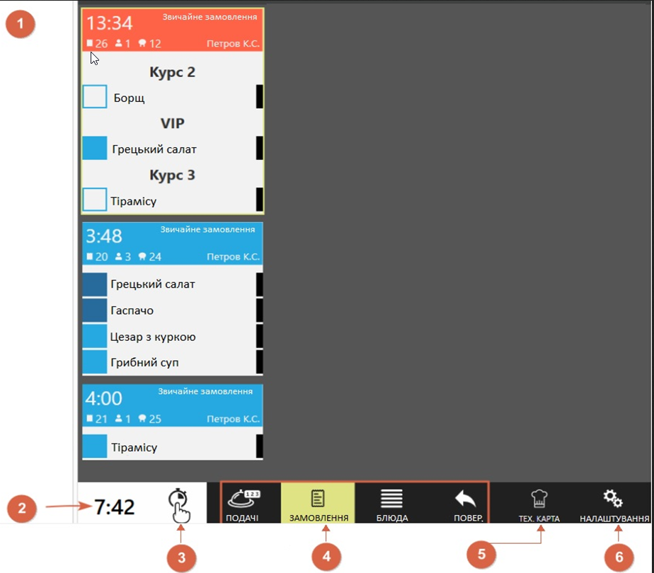 - Страви – На екрані відображається список страв, які потрібно приготувати. Найтерміновіша страва займає перший рядок у списку.